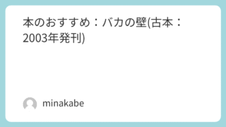 書評 本のおすすめ:バカの壁(古本:2003年発刊) 皆さまこんにちは。水壁でございます。本日は前回少々言及した古本をご紹介させていただきます。最後までお付き合いいただけますと幸いです。バカの壁こちらはタイトルにある通り古本でございます。一応普段通りリンクは置いておきますが、古本屋などで購入す... 2025.09.26 書評