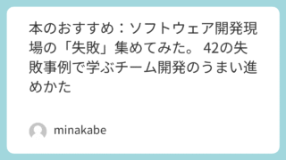 書評 本のおすすめ:ソフトウェア開発現場の「失敗」集めてみた。 42の失敗事例で学ぶチーム開発のうまい進めかた 皆さまこんにちは。水壁でございます。本日はエンジニア用の本の紹介となります。ソフトウェア開発現場の「失敗」集めてみた。 42の失敗事例で学ぶチーム開発のうまい進めかたこの記事を読んでいる方は、普段どういった目的で本を読んでいるでしょうか?筆... 2025.08.23 書評